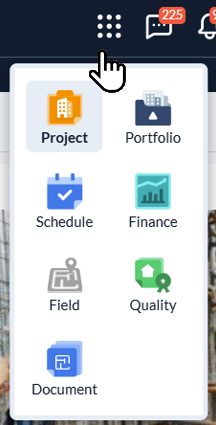 | - | Allows you to open between different management project management modules by selecting their category. The availability of the modules depends on the permissions defined for the role(s) assigned to you. |