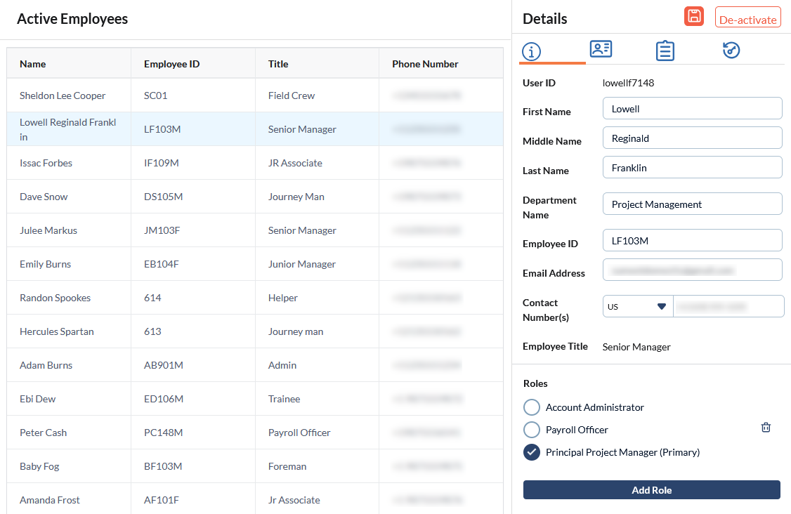 You can edit the details and roles of the employee from this pane. See Edit employee details and Manage Roles Assigned to a User for more details.