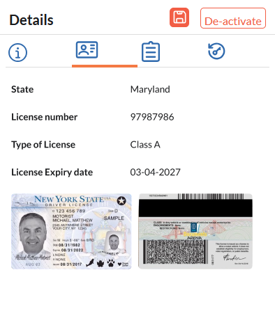 The license tab shows the details of the any work licence or driver's license, as submitted by the worker through their mobile application.