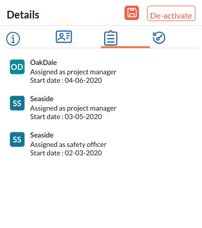 The assignments tab shows the list of projects currently associated with the employee. The list shows the chronological order in which the projects were assigned to him/her.