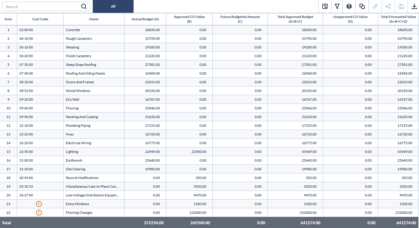 Total Forecasted Value: The projected total cost for the task, including the actual budget, approved and future amounts, and any pending (unapproved) change orders. This provides a comprehensive forecast of potential financial commitments.