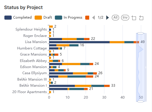 The bar chart shows the list of projects and the number of RFIs by status, like draft, in progress, answered, and completed.