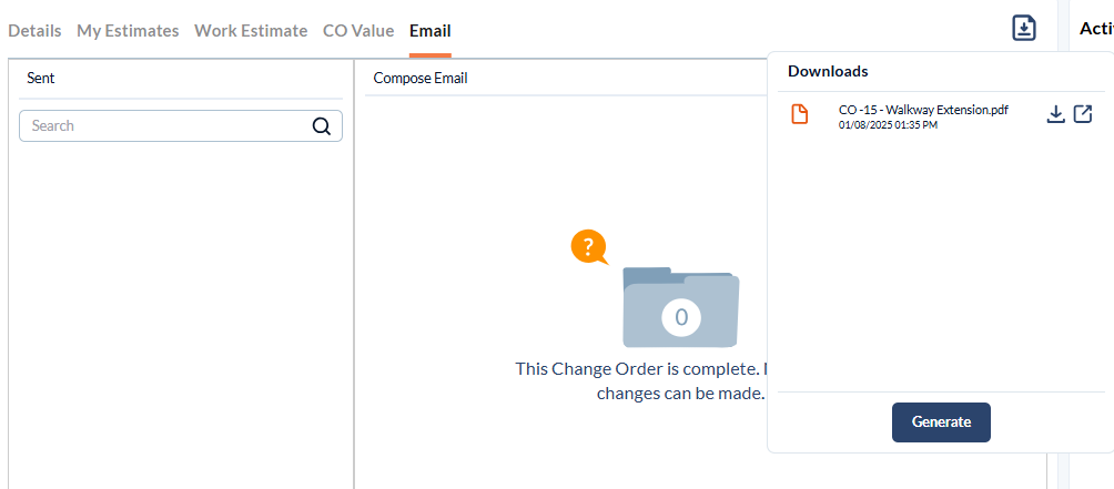 The system compiles the PDF version of the CO, including all estimates and attachments included till the current point in time. The process takes around 30 seconds. The output PDF contains all sections, excluding the activity log of the CO. You can view/download the PDF from the same pane.