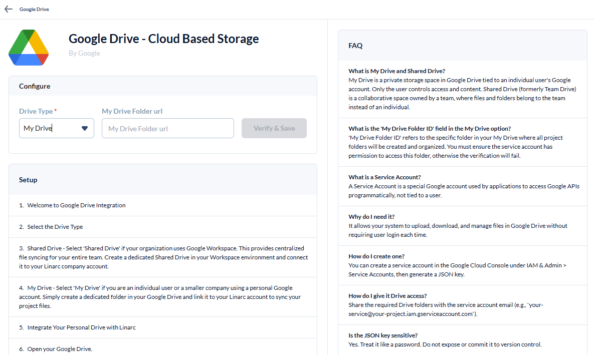 Link a dedicated Google Drive folder to your Linarc company account to establish a seamless 2-way sync for your project documents. You can choose to use an existing folder, but ee highly recommend creating a brand-new folder specifically for this integration.