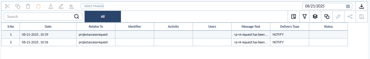 - Delivery Type - The mode through which the notification was sent, such as Email, In-App, or Push Notification.