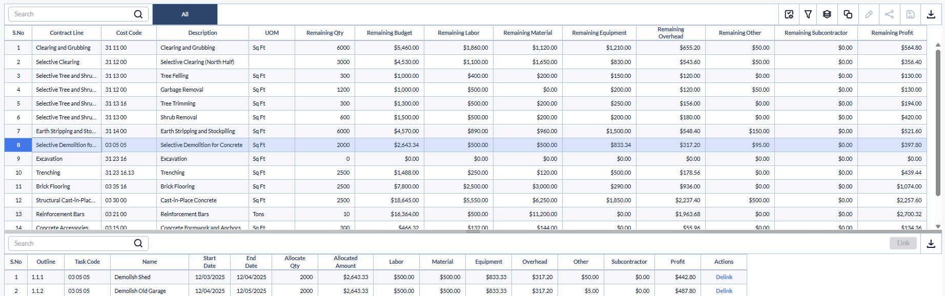 You can easily modify and redistribute funds allocated from a budget item to scheduled tasks at any time before the work actually begins in the field. If you need to make changes, you can fully revert previously allotted funds back to the original budget.