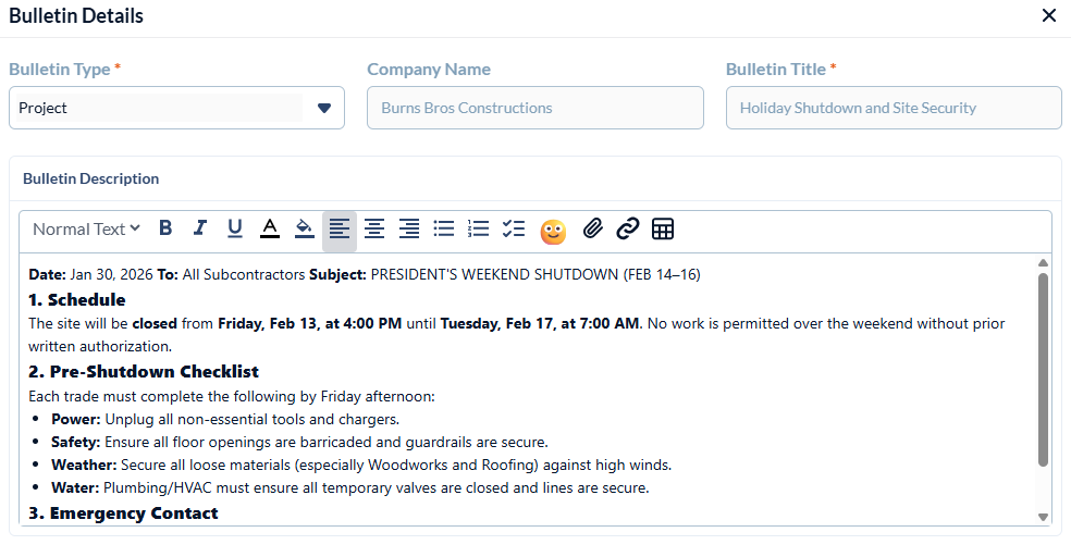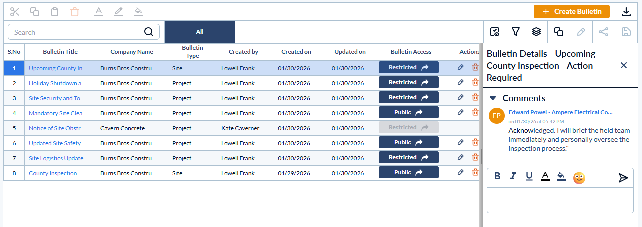 Recipients are instantly notified whenever a relevant bulletin is published. They can view the full message via their web console, formally acknowledge receipt, and post comments visible to all participants. The comment section serves as a collaborative space for logging feedback, asking questions, and seeking clarifications.