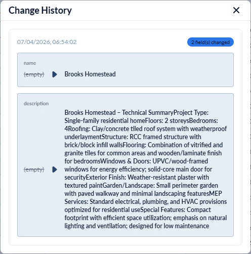 The pop-up shows the chronological list of changes made to various fields of the project details.